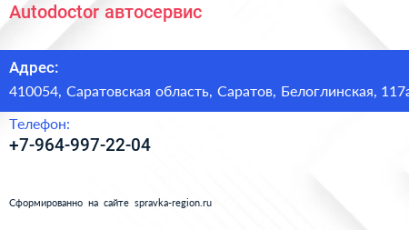 Autodoctor, автосервис по адресу 410054, Саратовская область, Саратов, Белоглинская, 117а в дальнейшем Организация, размещена в следующих категориях:
