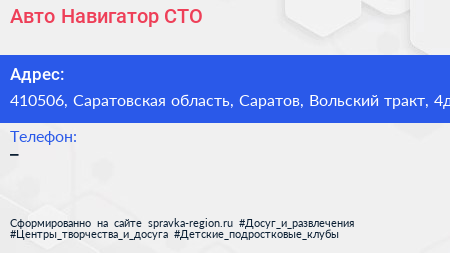 Авто-Навигатор, СТО по адресу 410506, Саратовская область, Саратов, Вольский тракт, 4д в дальнейшем Организация, размещена в следующих категориях: