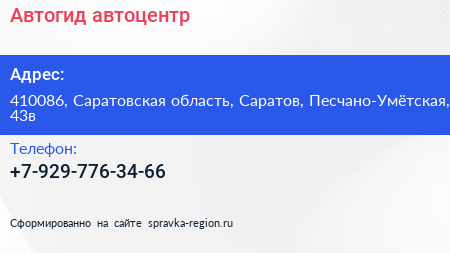 Автогид, автоцентр по адресу 410086, Саратовская область, Саратов, Песчано-Умётская, 43в в дальнейшем Организация, размещена в следующих категориях:
