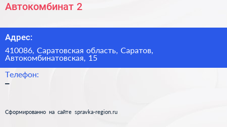 Автокомбинат-2 по адресу 410086, Саратовская область, Саратов, Автокомбинатовская, 15 в дальнейшем Организация, размещена в следующих категориях: