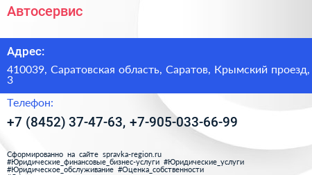 Автосервис по адресу 410039, Саратовская область, Саратов, Крымский проезд, 3 в дальнейшем Организация, размещена в следующих категориях: