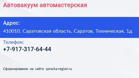 Автовакуум, автомастерская по адресу 410010, Саратовская область, Саратов, Техническая, 1д в дальнейшем Организация, размещена в следующих категориях: