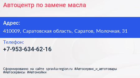 Автоцентр по замене масла по адресу 410009, Саратовская область, Саратов, Молочная, 31 в дальнейшем Организация, размещена в следующих категориях: