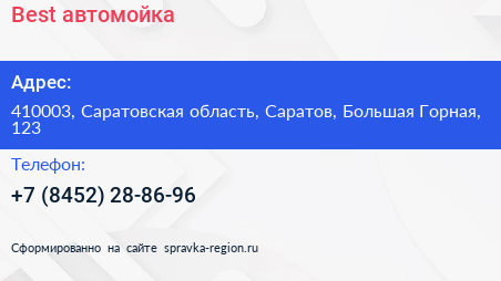 Best, автомойка по адресу 410003, Саратовская область, Саратов, Большая Горная, 123 в дальнейшем Организация, размещена в следующих категориях:
