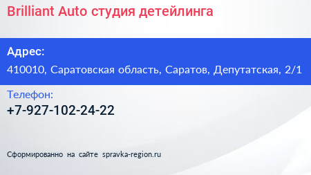 Brilliant Auto, студия детейлинга по адресу 410010, Саратовская область, Саратов, Депутатская, 2/1 в дальнейшем Организация, размещена в следующих категориях: