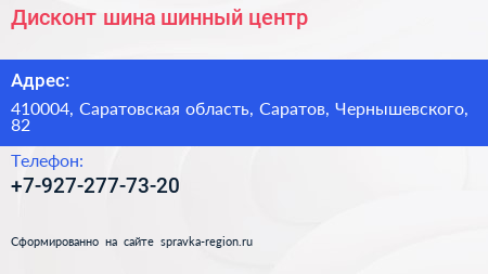 Дисконт-шина, шинный центр по адресу 410004, Саратовская область, Саратов, Чернышевского, 82 в дальнейшем Организация, размещена в следующих категориях:
