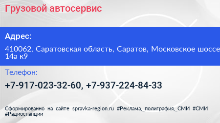 Грузовой автосервис по адресу 410062, Саратовская область, Саратов, Московское шоссе, 14а к9 в дальнейшем Организация, размещена в следующих категориях: