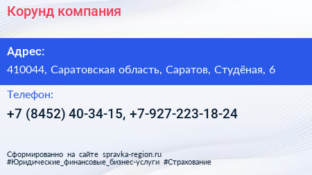 Корунд, компания по адресу 410044, Саратовская область, Саратов, Студёная, 6 в дальнейшем Организация, размещена в следующих категориях: