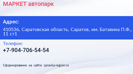 МАРКЕТ, автопарк по адресу 410536, Саратовская область, Саратов, им. Батавина П.Ф., 11 ст1 в дальнейшем Организация, размещена в следующих категориях: