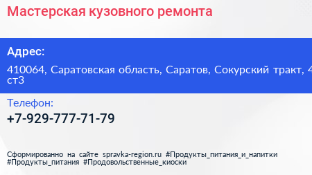 Мастерская кузовного ремонта по адресу 410064, Саратовская область, Саратов, Сокурский тракт, 4 ст3 в дальнейшем Организация, размещена в следующих категориях: