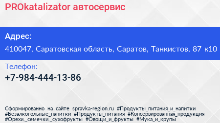 PROkatalizator, автосервис по адресу 410047, Саратовская область, Саратов, Танкистов, 87 к10 в дальнейшем Организация, размещена в следующих категориях: