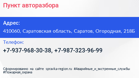 Пункт авторазбора по адресу 410060, Саратовская область, Саратов, Огородная, 218Б в дальнейшем Организация, размещена в следующих категориях: