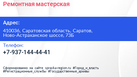 Ремонтная мастерская по адресу 410036, Саратовская область, Саратов, Ново-Астраханское шоссе, 73Б в дальнейшем Организация, размещена в следующих категориях: