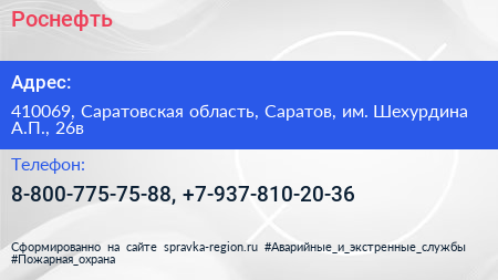 Роснефть по адресу 410069, Саратовская область, Саратов, им. Шехурдина А.П., 26в в дальнейшем Организация, размещена в следующих категориях: