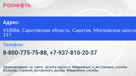 Роснефть по адресу 410086, Саратовская область, Саратов, Московское шоссе, 117 в дальнейшем Организация, размещена в следующих категориях: