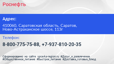 Роснефть по адресу 410060, Саратовская область, Саратов, Ново-Астраханское шоссе, 113г в дальнейшем Организация, размещена в следующих категориях: