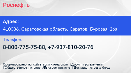 Роснефть по адресу 410086, Саратовская область, Саратов, Буровая, 26а в дальнейшем Организация, размещена в следующих категориях: