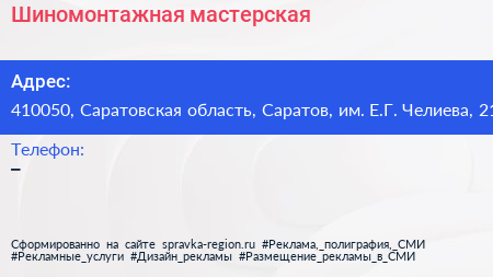 Шиномонтажная мастерская по адресу 410050, Саратовская область, Саратов, им. Е.Г. Челиева, 21 в дальнейшем Организация, размещена в следующих категориях: