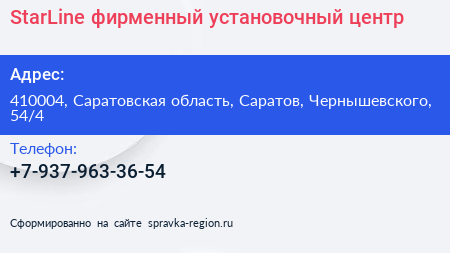 StarLine, фирменный установочный центр по адресу 410004, Саратовская область, Саратов, Чернышевского, 54/4 в дальнейшем Организация, размещена в следующих категориях: