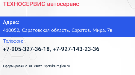 ТЕХНОСЕРВИС, автосервис по адресу 410052, Саратовская область, Саратов, Мира, 7в в дальнейшем Организация, размещена в следующих категориях: