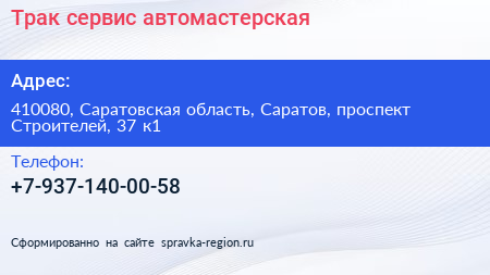 Трак сервис, автомастерская по адресу 410080, Саратовская область, Саратов, проспект Строителей, 37 к1 в дальнейшем Организация, размещена в следующих категориях: