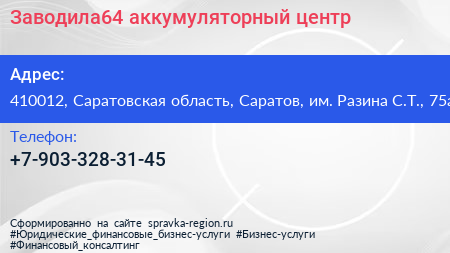 Заводила64, аккумуляторный центр по адресу 410012, Саратовская область, Саратов, им. Разина С.Т., 75а в дальнейшем Организация, размещена в следующих категориях: