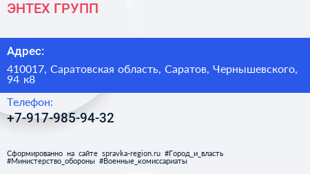 ЭНТЕХ ГРУПП по адресу 410017, Саратовская область, Саратов, Чернышевского, 94 к8 в дальнейшем Организация, размещена в следующих категориях: