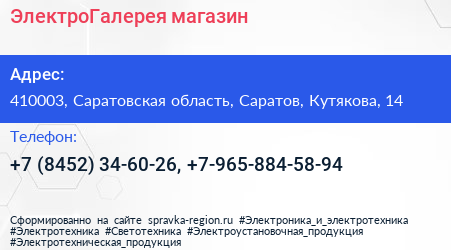 ЭлектроГалерея, магазин по адресу 410003, Саратовская область, Саратов, Кутякова, 14 в дальнейшем Организация, размещена в следующих категориях: