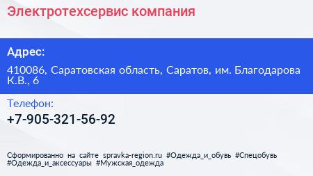 Электротехсервис, компания по адресу 410086, Саратовская область, Саратов, им. Благодарова К.В., 6 в дальнейшем Организация, размещена в следующих категориях: