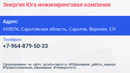 Энергия Юга, инжиниринговая компания по адресу 410076, Саратовская область, Саратов, Верхняя, 17г в дальнейшем Организация, размещена в следующих категориях: