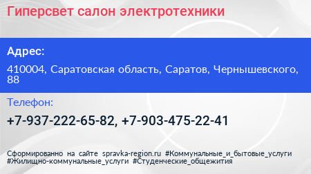 Гиперсвет, салон электротехники по адресу 410004, Саратовская область, Саратов, Чернышевского, 88 в дальнейшем Организация, размещена в следующих категориях: