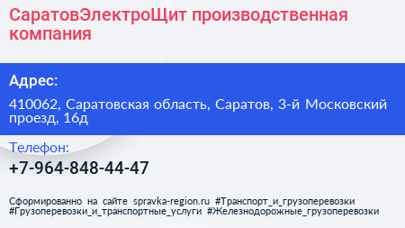 СаратовЭлектроЩит, производственная компания по адресу 410062, Саратовская область, Саратов, 3-й Московский проезд, 16д в дальнейшем Организация, размещена в следующих категориях: