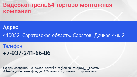Видеоконтроль64, торгово-монтажная компания по адресу 410052, Саратовская область, Саратов, Дачная 4-я, 2 в дальнейшем Организация, размещена в следующих категориях: