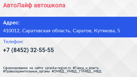 АвтоЛайф, автошкола по адресу 410012, Саратовская область, Саратов, Кутякова, 5 в дальнейшем Организация, размещена в следующих категориях: