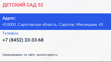 ДЕТСКИЙ САД № 52 по адресу 410003, Саратовская область, Саратов, Мясницкая, 43 в дальнейшем Организация, размещена в следующих категориях: