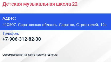 Детская музыкальная школа №22 по адресу 410507, Саратовская область, Саратов, Строителей, 12а в дальнейшем Организация, размещена в следующих категориях: