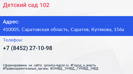 Детский сад №102 по адресу 410005, Саратовская область, Саратов, Кутякова, 156а в дальнейшем Организация, размещена в следующих категориях: