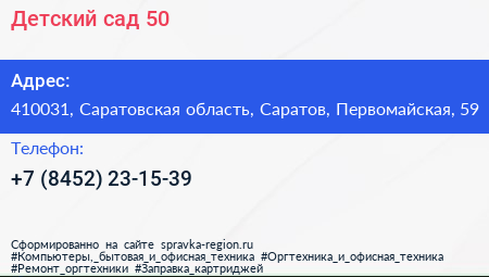 Детский сад №50 по адресу 410031, Саратовская область, Саратов, Первомайская, 59 в дальнейшем Организация, размещена в следующих категориях: