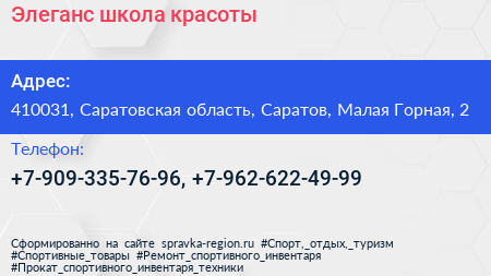 Элеганс, школа красоты по адресу 410031, Саратовская область, Саратов, Малая Горная, 2 в дальнейшем Организация, размещена в следующих категориях:
