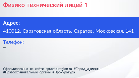 Физико-технический лицей №1 по адресу 410012, Саратовская область, Саратов, Московская, 141 в дальнейшем Организация, размещена в следующих категориях: