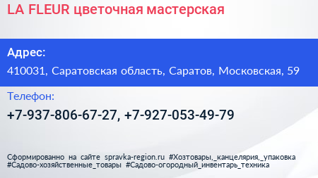 LA FLEUR, цветочная мастерская по адресу 410031, Саратовская область, Саратов, Московская, 59 в дальнейшем Организация, размещена в следующих категориях: