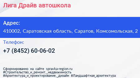 Лига Драйв, автошкола по адресу 410002, Саратовская область, Саратов, Комсомольская, 2 в дальнейшем Организация, размещена в следующих категориях: