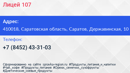Лицей №107 по адресу 410018, Саратовская область, Саратов, Державинская, 10 в дальнейшем Организация, размещена в следующих категориях: