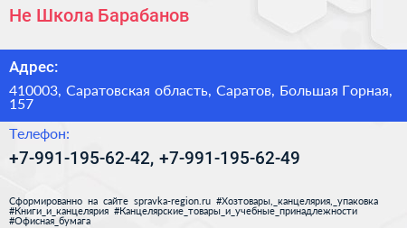 Не Школа Барабанов по адресу 410003, Саратовская область, Саратов, Большая Горная, 157 в дальнейшем Организация, размещена в следующих категориях: