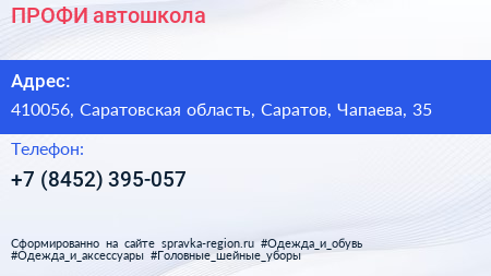ПРОФИ, автошкола по адресу 410056, Саратовская область, Саратов, Чапаева, 35 в дальнейшем Организация, размещена в следующих категориях: