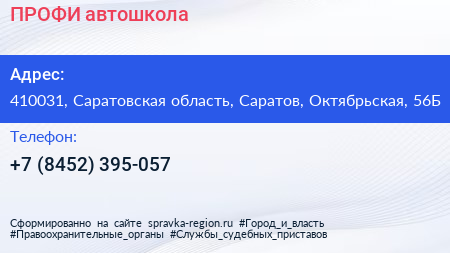 ПРОФИ, автошкола по адресу 410031, Саратовская область, Саратов, Октябрьская, 56Б в дальнейшем Организация, размещена в следующих категориях: