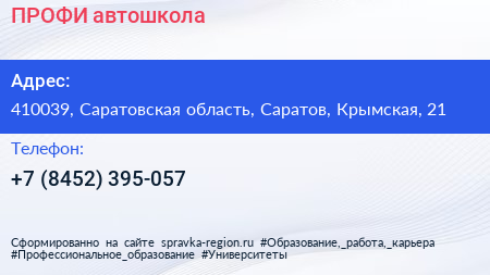 ПРОФИ, автошкола по адресу 410039, Саратовская область, Саратов, Крымская, 21 в дальнейшем Организация, размещена в следующих категориях: