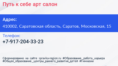 Путь к себе, арт-салон по адресу 410002, Саратовская область, Саратов, Московская, 15 в дальнейшем Организация, размещена в следующих категориях: