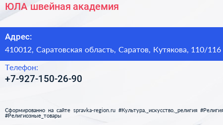 ЮЛА, швейная академия по адресу 410012, Саратовская область, Саратов, Кутякова, 110/116 в дальнейшем Организация, размещена в следующих категориях: