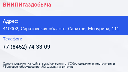 ВНИПИгаздобыча по адресу 410002, Саратовская область, Саратов, Мичурина, 111 в дальнейшем Организация, размещена в следующих категориях: